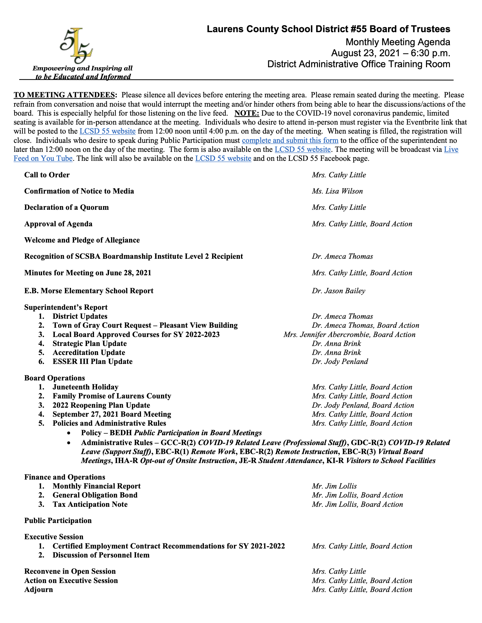 Laurens County School District 55 Board of Trustees Meeting August 23, 2021
