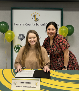 Ashley Walker was a student at EBM, Ford Elementary School (FES), and LDHS. She has always wanted to become a teacher and her experience as a student in the LDHS Teacher Cadet Program was pivotal in her decision to become an educator. She graduated from Lander University in December 2024 with a Bachelor of Science in Early Childhood Education. She was in the Cheer, Acro, and Tumbling Teams and a consistent Dean’s Lister at Lander University. She has passed the Teaching Praxis examinations and is certified in CPR and First Aid. She completed her student teaching at WES under Teaching Specialist and Second-Grade Teacher Angela Abercrombie. FES Principal Kimberly Penland was overjoyed to witness Walker sign her letter of intent to teach in LCSD 55.