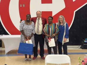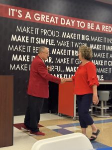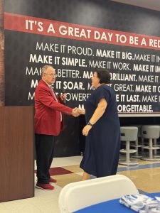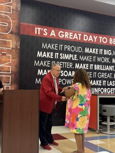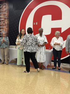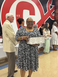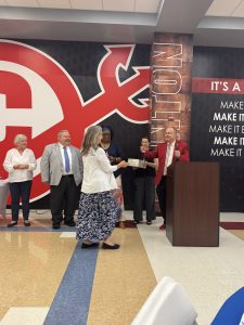 Among those honored were 2024–2025 retirees Georgia Fowler, Tammy Stewart, Penny May, Nancy Shealy, Mike Whitmire, Mary Waldron, Sandy Simmons, and Almira Young. Fowler, upon receiving her certificate and gift, offered a lighthearted reflection: “Retirement means putting on another set of tires and keep going,” drawing smiles and applause from the audience.