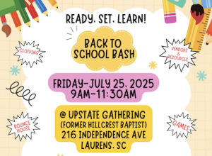 The Laurens County Sheriff’s Office, in partnership with Laurens County DSS and Upstate Gathering Church, will host the annual Back to School Bash on Friday, July 25, from 9:00 AM to 11:30 AM at Upstate Gathering Church, 216 Independence Avenue in Laurens (formerly Hillcrest Baptist Church).