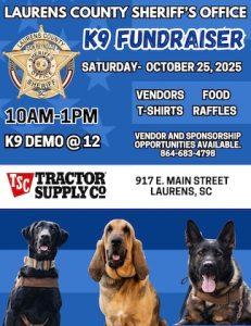 September 20, 2025The Laurens County Sheriff’s Office invites the community to mark their calendars for the Annual K9 Fundraiser on Saturday, October 25, from 10:00 a.m. to 1:00 p.m. at Laurens Tractor Supply.