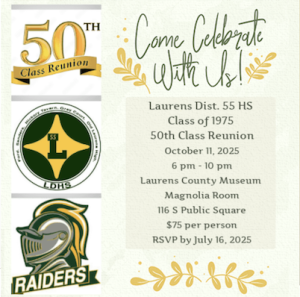 April 30, 2025The Laurens District 55 High School Class of 1975 is marking a major milestone this fall — their 50th reunion. Members of the class are invited to gather for an evening of memories, music, and reconnecting with old friends on Saturday, October 11, 2025, from 6:00 p.m. to 10:00 p.m. at the Laurens County Museum’s Magnolia Room, located at 116 South Public Square, Laurens, SC.
