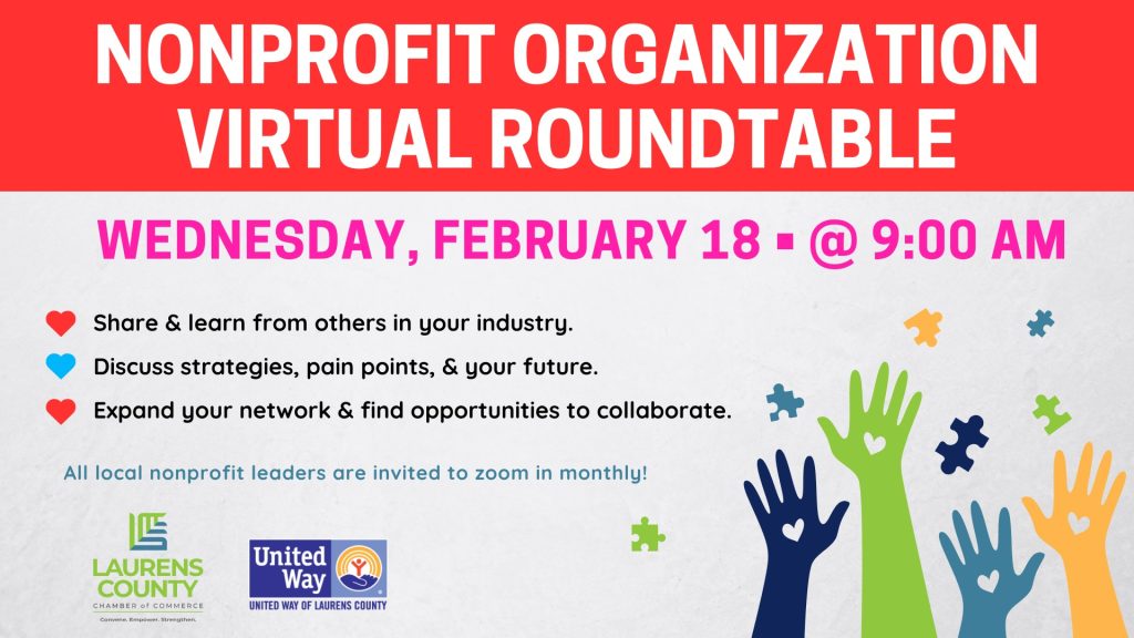 Nonprofit leaders across Laurens County are invited to participate in the next monthly Virtual Nonprofit Roundtable hosted by the Laurens…