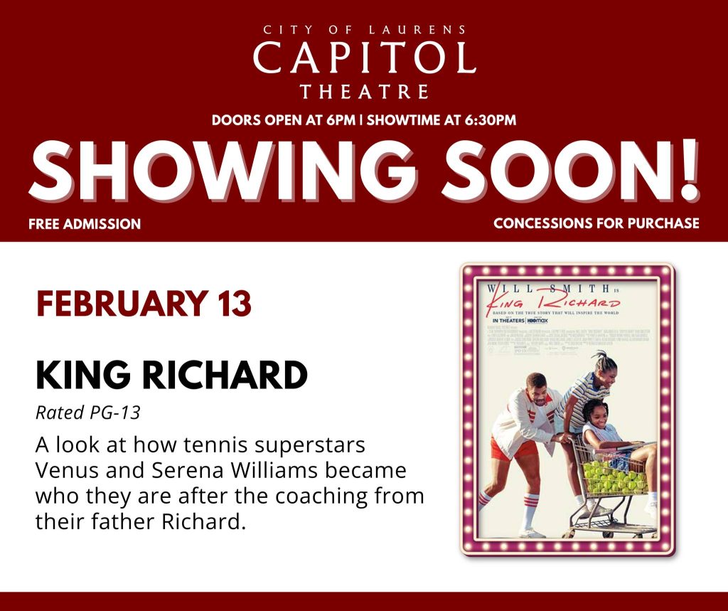 The City of Laurens invites the community to enjoy a free movie night this Friday, February 13, at the historic…
