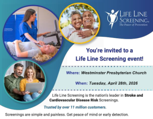 April 14, 2026Residents age 40 and older are invited to take advantage of an upcoming preventive health screening opportunity when Life Line Screening visits Westminster Presbyterian Church on Tuesday, April 28, 2026.