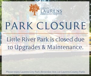 While Little River Park is closed, residents are encouraged to take advantage of other nearby recreational spaces, including Laurens City Park on Brownlee Avenue, as well as parks operated by Laurens County.