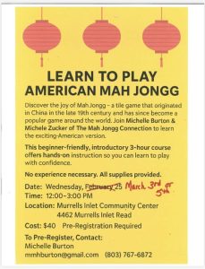 February 9, 2026Michelle Burton and Michele Zucker of the Mah Jongg Connection in Pawleys Island are teaching Introductory Mah Jongg classes at the Murrells Inlet Community Center to help individuals interested in learning how to play the popular tile game. The first class scheduled for Wednesday, February 25 has already filled up so they have added two more classes – one on March 3 and and another on March 5.