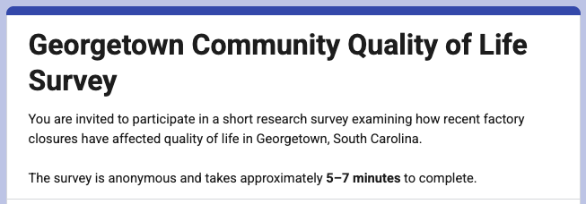 He is studying how the recent steel and paper mill closures have impacted quality of life of residents in Georgetown, South Carolina. Using a short, anonymous survey, he hopes to gather input from adult Georgetown residents (age 18+) on topics such as job stability, financial stress, overall stress levels, quality of life, and outlook for the community’s future. The goal of the research is to better understand how large employer closures are experienced at the community level. Results will be used solely for a high school academic research paper.