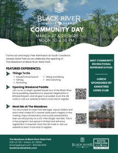 To celebrate the park’s opening, the community is invited to come out Friday, March 27 and Saturday, March 28 from noon to 4:00 pm to explore South Carolina’s newest state park.