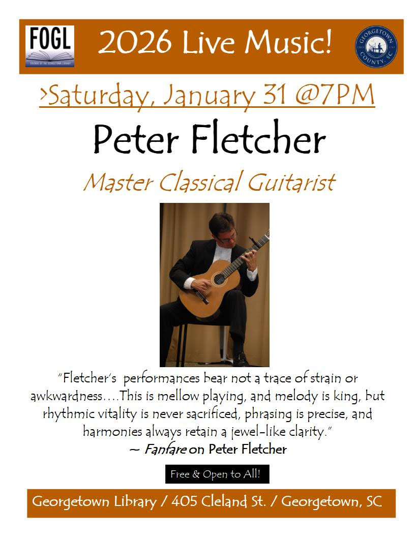 Join us Wednesdays in January from 10:30-11:00am in the DeBordieu-Cross Auditorium for stories, songs and early-literacy fun! For babies, toddlers, preschoolers and their caregiver(s). For more information call 843-545-3349.