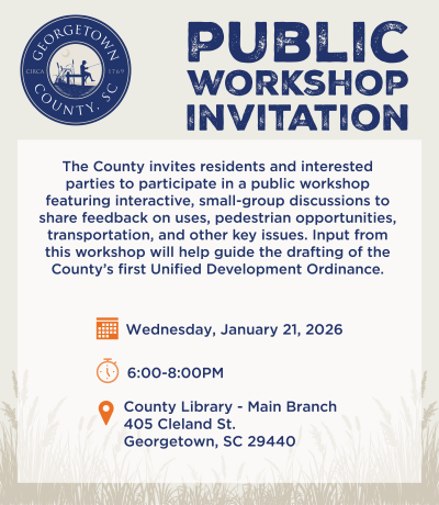 Georgetown County invites residents, business owners and other interested parties to participate in a public workshop focused on shaping the County’s first Unified Development Ordinance (UDO). The interactive workshop will…