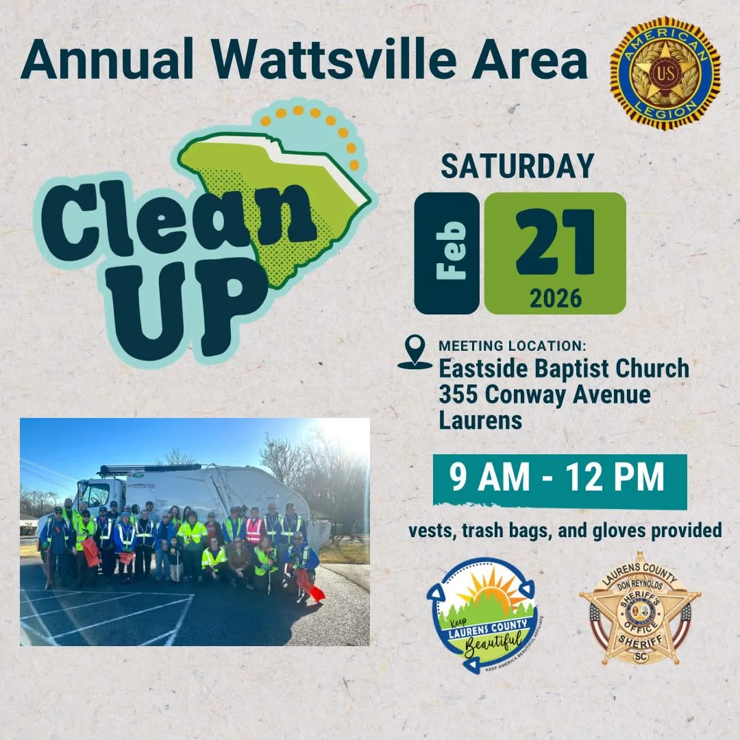 MEETING LOCATION: Eastside Baptist Church 355 Conway Avenue Laurens 9 AM - 12 PM vests, trash bags, and gloves provided