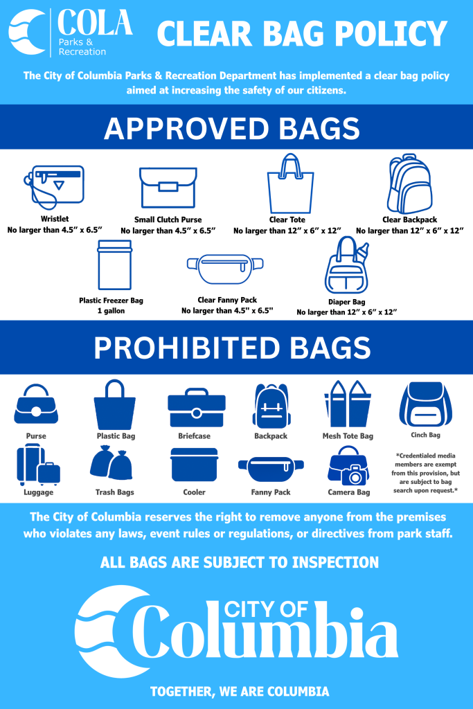 Credentialed media members are exempt from the clear bag requirement but may be subject to a bag search upon request.