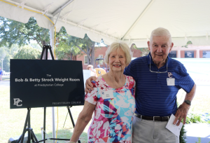 The rededicated Bob and Betty Strock Weight Room honors former coach and P.E. professor Bob Strock and his wife, Betty, both honorary alumni and stalwart Blue Hose supporters.