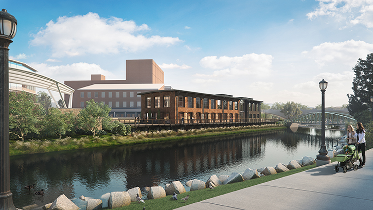Special features of this project include a large outdoor deck connecting to a walkway which cantilevers from the Wyche along the river, and a large gathering space facing Main Street, all of which may be enjoyed by the public on a regular basis. The landscaping, by Earth Design, will feature lush, environmentally friendly plantings carefully chosen to evolve with each season.