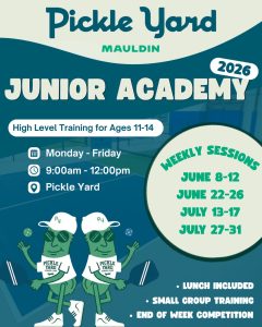 April 26, 2026Pickle Yard in Mauldin is offering a new Junior Academy program this summer, giving young athletes ages 11 to 14 the opportunity to develop their pickleball skills through high-level training, small group instruction, and end-of-week competition.