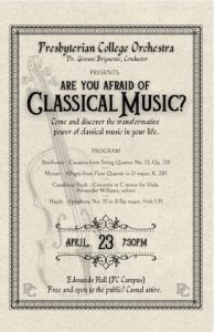 April 20, 2026The Presbyterian College Orchestra, under the direction of Dr. Giovani Briguente, will present “Are You Afraid of Classical Music?” on Thursday, April 23, at 7:30 p.m. in Edmunds Hall on the Presbyterian College campus. The concert is free and open to the public, and casual attire is welcome.