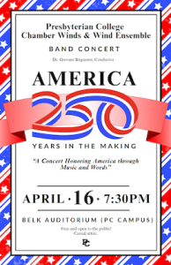 March 23, 2026The Presbyterian College Department of Music will present a special evening of music and reflection as the Chamber Winds and Wind Ensemble take the stage for a spring band concert titled “America: Years in the Making.”