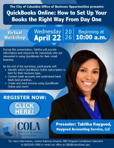 March 3, 2026The City of Columbia’s Office of Business Opportunities is hosting QuickBooks Online: How to Set Up Your Books the Right Way From Day One on Wednesday, April 22, 2026, beginning at 10:00 a.m.