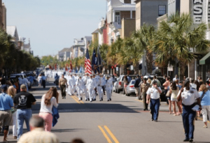 Hundreds of Charlestonians, visitors, alumni, family and friends line the streets to cheer for the knobs as they march, dressed in their brilliant, white uniforms, to attend “The Oath Renewal on The Citadel Green” which will get underway at about 3:30 p.m.