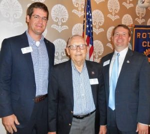 October 3, 2018Capital Rotary member Gene Oliver (center in photo) was recognized Oct. 3 for his latest donation to The Rotary Foundation in support of international programs promoting peace and world understanding. Oliver is a Paul Harris Fellow plus-three giver (signifying an initial $1,000 donation with three additional gifts in the same amount). Oliver – a retired college administrator – joined the Capital club nine years ago and has been a Rotarian for more than 50 years. Immediate past president Blake DuBose (left) is the club’s chair for Foundation contributions, while current president Philip Flynn is at right.