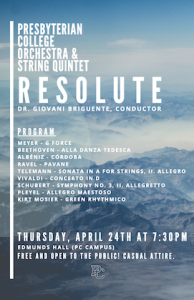 April 23, 2025The upcoming student concert, Resolute, invites the community to experience a powerful evening of music that celebrates determination, resilience, and calm strength. The performance will take place on Thursday, April 24, 2025, at 7:30 p.m. in Edmunds Hall on the Presbyterian College campus. The event is free and open to the public, and guests are encouraged to attend in casual attire.