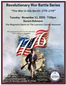 November 4, 2025The Laurens County Museum will continue its Revolutionary War Battle Lecture Series on Tuesday, November 11, 2025, at 7:00 p.m. Historian and battlefield preservationist Durant Ashmore will present “The War in the North, 1775–1778” at the Museum, located at 116 South Public Square in Laurens.
