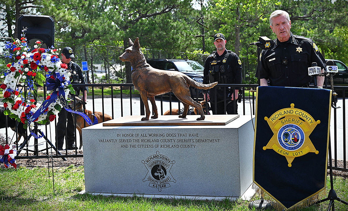 “This [the K-9 statue for RCSD] is a fitting memorial,” said Richland County Sheriff Leon Lott during the May 15 unveiling ceremony. “This past Sunday, not only were human law enforcement officers lost in the line-of-duty recognized, but fallen K-9s, nationwide. Through the years we’ve had several Richland County K-9s lost in the line of duty. This [the RCSD memorial] recognizes both those K-9s we have lost to natural causes and those lost in the line-of-duty, the KIAs.”