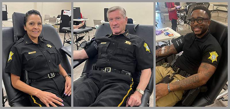 Pictured (L-R) Deputy Chief Maria Yturria, Sheriff Leon Lott, and Sergeant Laquan Sumpter donate blood during the day-long Battle of the Badges, Friday, June 27.