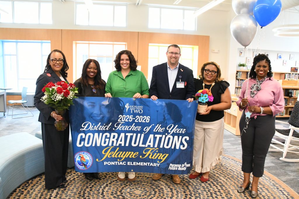 September 16, 2025Richland School District Two announced that Jelayne King, a Special Education Teacher at Pontiac Elementary School, has been named the 2025–2026 District Teacher of the Year. Superintendent Dr. Kim D. Moore, members of the Board of Trustees, and district leaders surprised King with the honor earlier this week.