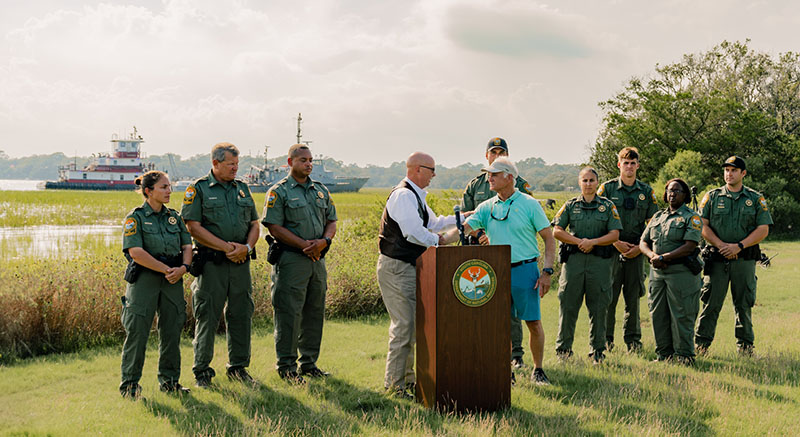 – Pictured are SCDNR Director Tom Mullikin and and S.C. Sen. Chip Campsen flanked by several SCDNR law enforcement officers (game wardens) at Bohicket Creek, Aug. 19. Photo by Allison DeVore, SCDNR.