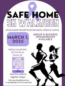 February 25, 2025This Saturday, March 1, the SAFE Home Walk/Run will take place at CrossFit 864 in Clinton at 9 a.m., bringing the community together to support survivors of domestic violence in Laurens County.