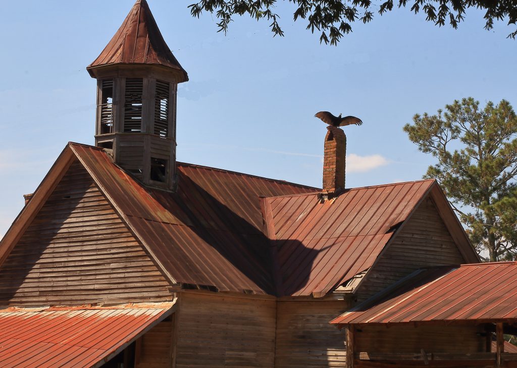 High shoulders bordered the road, a giveaway that Sardis Road is a road of the old days. And if that didn’t convince me of its age, a magnificent school, I hear tell, did. It seemed European in style and the buzzard atop a chimney agreed, spreading its wings wide in affirmation, the legendary horaltic pose.
