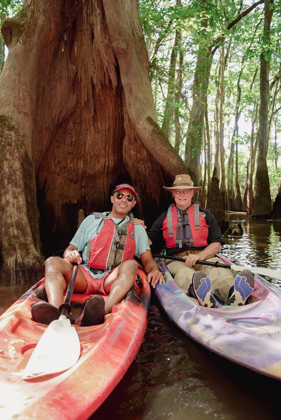 S.C. Senator Mike Reichenbach and S.C. Department of Natural Resources (SCDNR) Boardmember Jerry Lee joined Dr. Tom Mullikin, director of SCDNR; on the historic Lynches River in Florence County, S.C., Saturday, July 19. The kayak-paddling excursion was part of the monthlong, statewide, South Carolina 7 (SC7) Expedition from the mountains to the sea. [Sen. Reichenbach and Dr. Mullikin are pictured here].