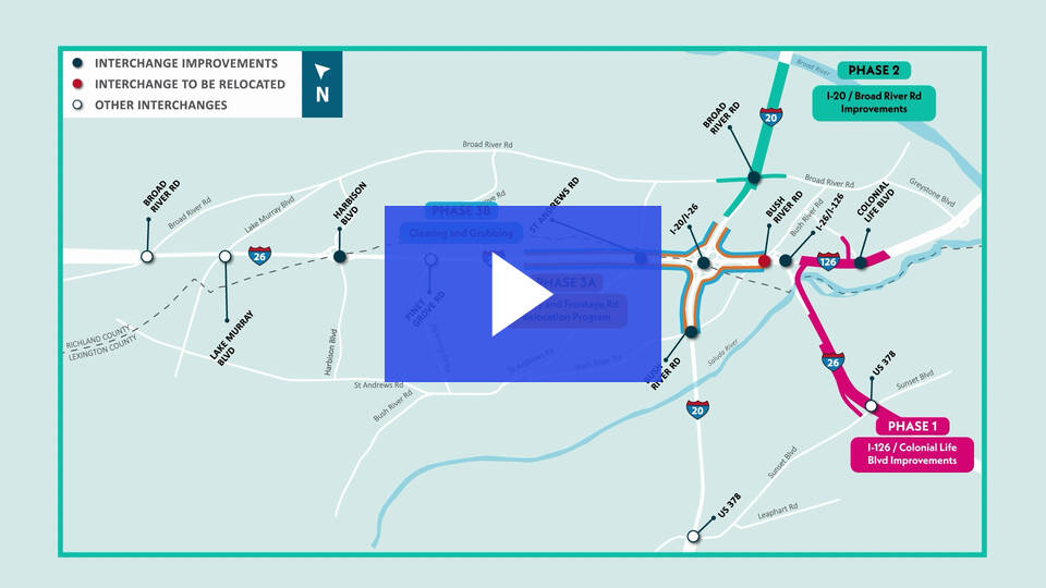 Crews will be clearing and grubbing approximately 170 acres across the I-20/I-26, St. Andrews Road/I-26, and Bush River Road/I-20 interchanges. Most of this work will occur during daytime hours, but temporary lane closures may occur when work takes place at night.