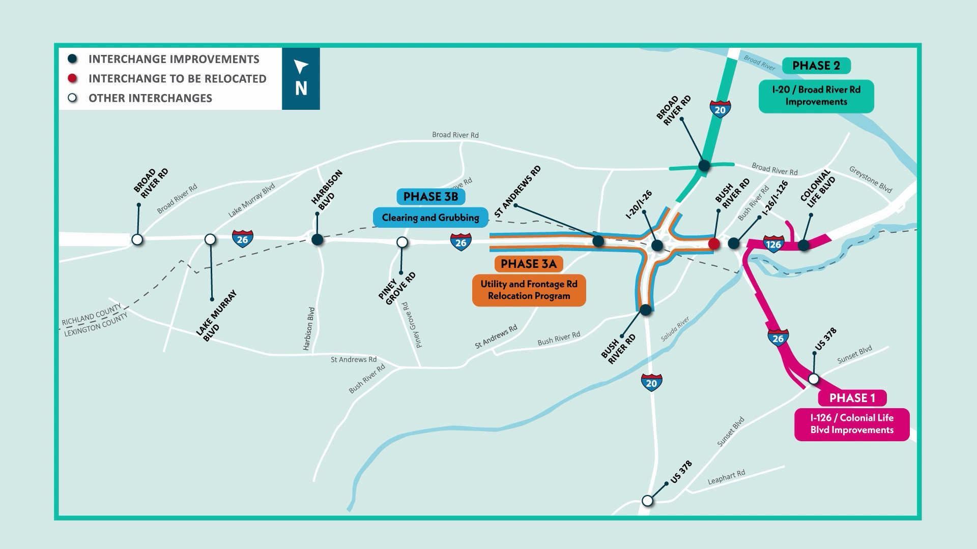 Crews will be clearing and grubbing approximately 170 acres across the I-20/I-26, St. Andrews Road/I-26, and Bush River Road/I-20 interchanges. Most of this work will occur during daytime hours, but temporary lane closures may occur when work takes place at night.