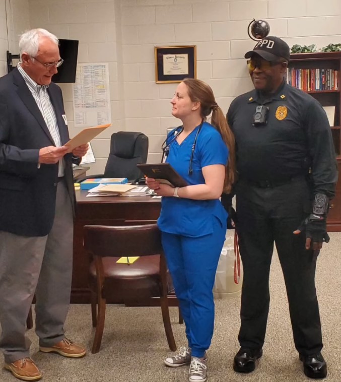 On February 13, during the PES Grandparents Luncheon Day, one of the students Grandparents suffered a life threatening stroke in the parking lot. Upon hearing about the emergency, as Pelion Police were arriving, Nurse Hale responded to the incident and provided care, based on her training and experience, until the arrival of EMS.