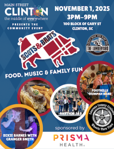 October 26, 2025On Saturday, November 1, 2025, Main Street Clinton will host Scots & Brats on the 100 block of Gary Street, transforming The Lumberyard into a spirited celebration from 3:00 to 9:00 p.m. Sponsored by Prisma Health, this family-friendly festival will honor Scottish heritage and local pride for Presbyterian College’s Blue Hose, offering an evening filled with music, games, and local flavors.
