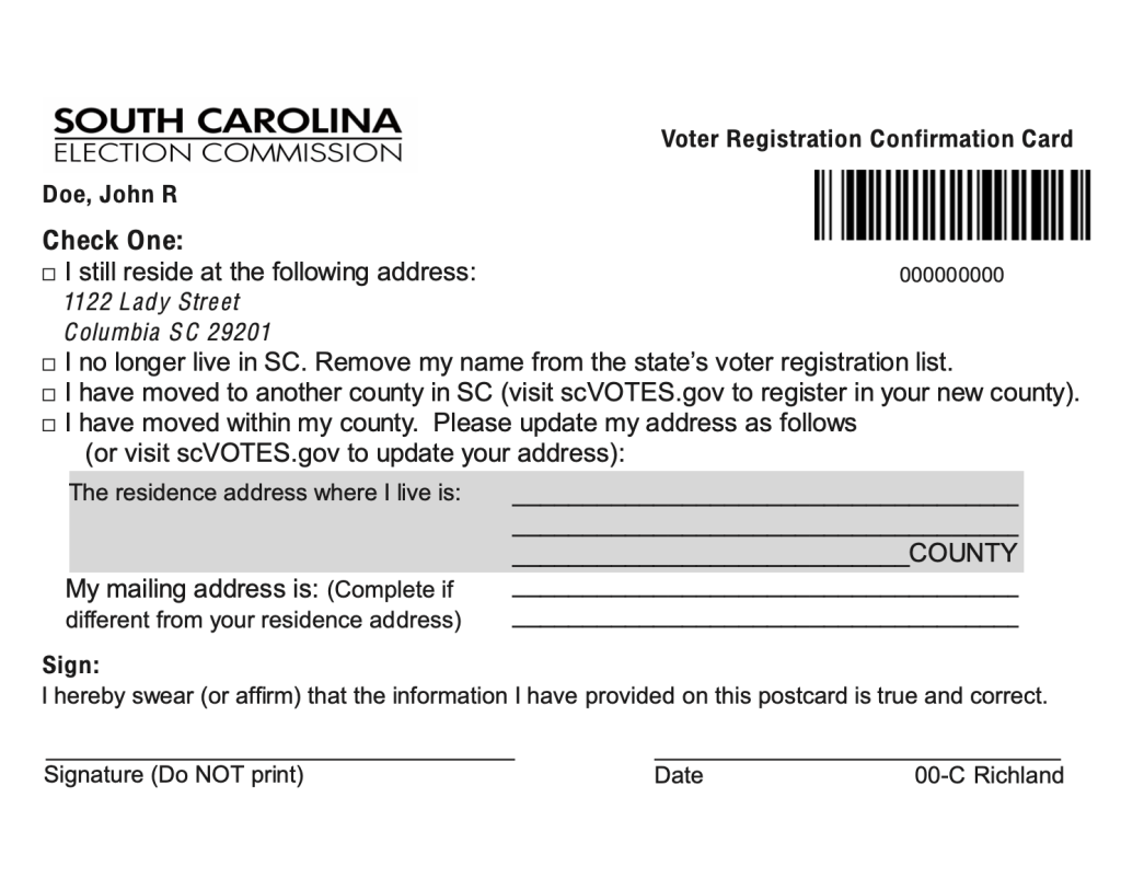 The vast majority of South Carolina’s approximate 3.4 million voters will be unaffected by the mailing. Anyone who has voted in an election since November 2020 or registered to vote during that time will not receive the notice. Anyone who has not participated in an election or not made an update to their registration record since November 2020 (about five percent of the state’s registered voters) will receive the notice.