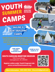 Registration for all sailing and boat building camps must be completed online at the SC Maritime Museum website. Sessions are limited to 12 campers each to ensure personalized instruction.