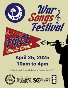 April 16, 2025The South Carolina Military Museum will host “War Songs,” a free, public music festival, April 26, 2025, from 10:00 a.m. to 4:00 p.m. at 1 National Guard Rd., Columbia, SC 29201. The event will showcase local musical talent, celebrating community and military history with genres ranging from Revolutionary War-era strings to bluegrass and brass bands. Food vendors will be on site.