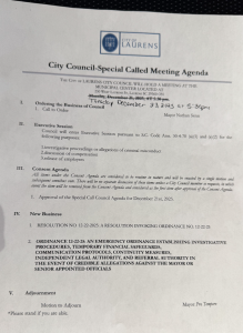Special Called Meeting of City of Laurens Rescheduled to December 23