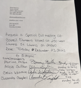 December 22, 2025The City of Laurens Council has rescheduled a special called meeting originally set for Monday, December 22, moving it to Tuesday, December 23.