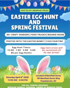 March 31, 2026Families from across the Upstate are invited to celebrate the season at the Spring Market & Easter Egg Hunt this Saturday, April 4, hosted by Barefoot Acres SC in partnership with Memphis Fresh.