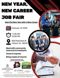The Start the New Year with a New Career job fair will be held on Wednesday, February 18, 2026, from 11:00 a.m. to 2:00 p.m. at 600 Peachtree Street in Clinton. The event is sponsored by Upper Savannah SC Works System and the University of South Carolina Union Laurens Location.