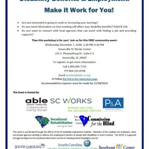 “Disability Benefits & Employment: Make it Work for You!” will be from 1:30 p.m. to 3:30 p.m. on December 7, 2016 at the Greenville SC Works Center, 225 S. Pleasantburg Dr. Suite E-1. Interested participants can register by visiting the registration link, calling 1.800.681.7715, or emailing [email protected].