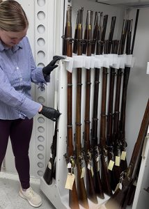 Not everything is stored in the new facility yet. Megan has more than a thousand items in her large-but-crowded office waiting to be fully processed – Revolutionary War firearms, more swords from multiple conflicts, even a torpedo – not the self-propelled submarine kind, but what we would call a “mine” today. And more.
