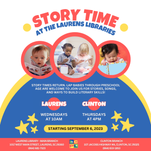Join Miss Jordan at the Laurens branch on Wednesdays at 10 am beginning September 6. Miss Dottieās Story Time at the Clinton Library is on Thursdays at 4 pm. The first of these is September 7th. Enjoy stories, songs, and fun with your friends at the Laurens Libraries. This program is for ages 0-5.