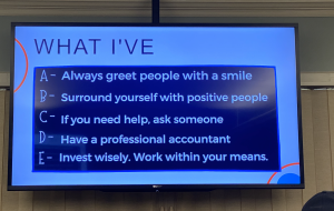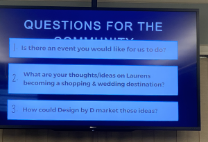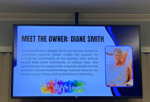 Each event begins with a presentation by a local entrepreneur about their business and challenges. The presentation ends with 3-4 questions for the audience and then the conversation begins. The presenter for this meeting was Diane Smith, owner of Designs by D in Laurens.