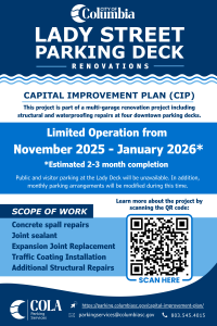Starting in November 2025 and continuing for approximately 12 weeks, public and visitor parking at the Lady Street Parking Deck will be unavailable due to planned improvements. During this time, monthly parking arrangements will also be modified.